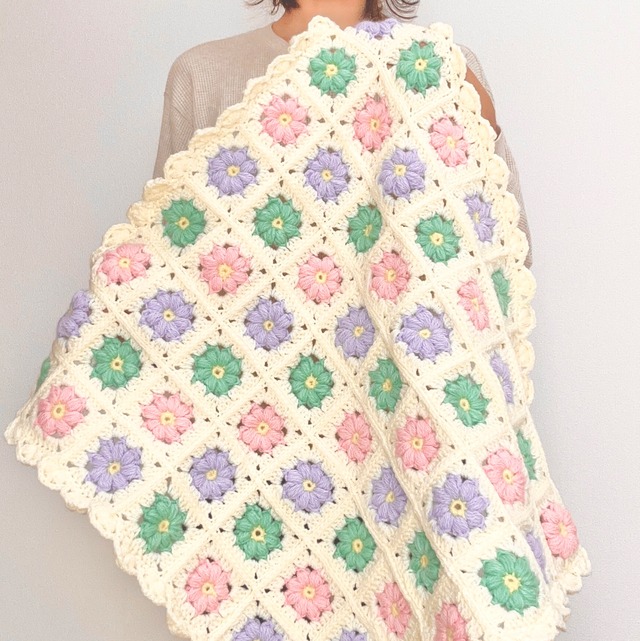 横87㎝× 縦60㎝ アクリル ベビーレモン ベビーミント 色言葉 明るさ・才能・優しさ 秋冬にはもちろん、春の肌寒い時期、夏は冷房避けとしてもおすすめです。 ぷっくり大きなデイジーが特徴で、パステルカラーで合わせ、色味からも伝わる、スカッと可愛い色合いに仕上げました。 お部屋の雰囲気をグッと明るくしてくれるブランケットです。 お仕事や、おうち時間、アウトドアでサッと可愛く羽織れるブランケットです。 ベビーカーに赤ちゃんを乗せた際に、かけてあげるブランケットとしてもおすすめです。 ・・・・・・・・・・・・・・・・・・・・・・・・ 子供をベビーカーに乗せて、作ったブランケットを被せていると、街行くたびに話しかけられ作品を褒められました。 友達にプレゼントしたところ、同じ経験をし大変喜んでくれました。 上記の経験のみならず、その時感じた幸せが私の作品を通して広がればいいなと思い、作品を丁寧に作っております。 ・・・・・・・・・・・・・・・・・・・・・・・・