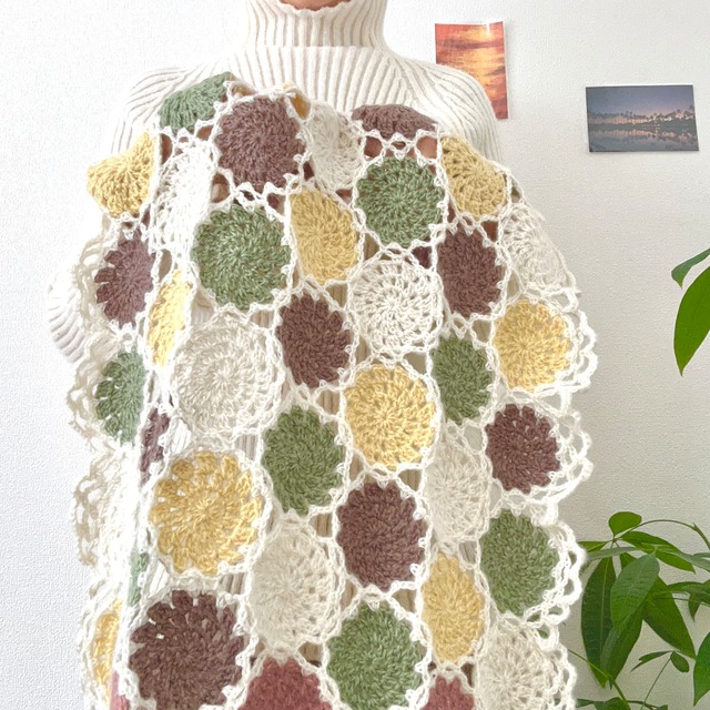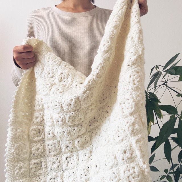 ホワイトチョコレート モヘヤふんわりモチーフ編みブランケット
