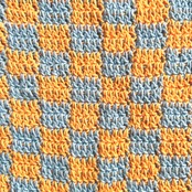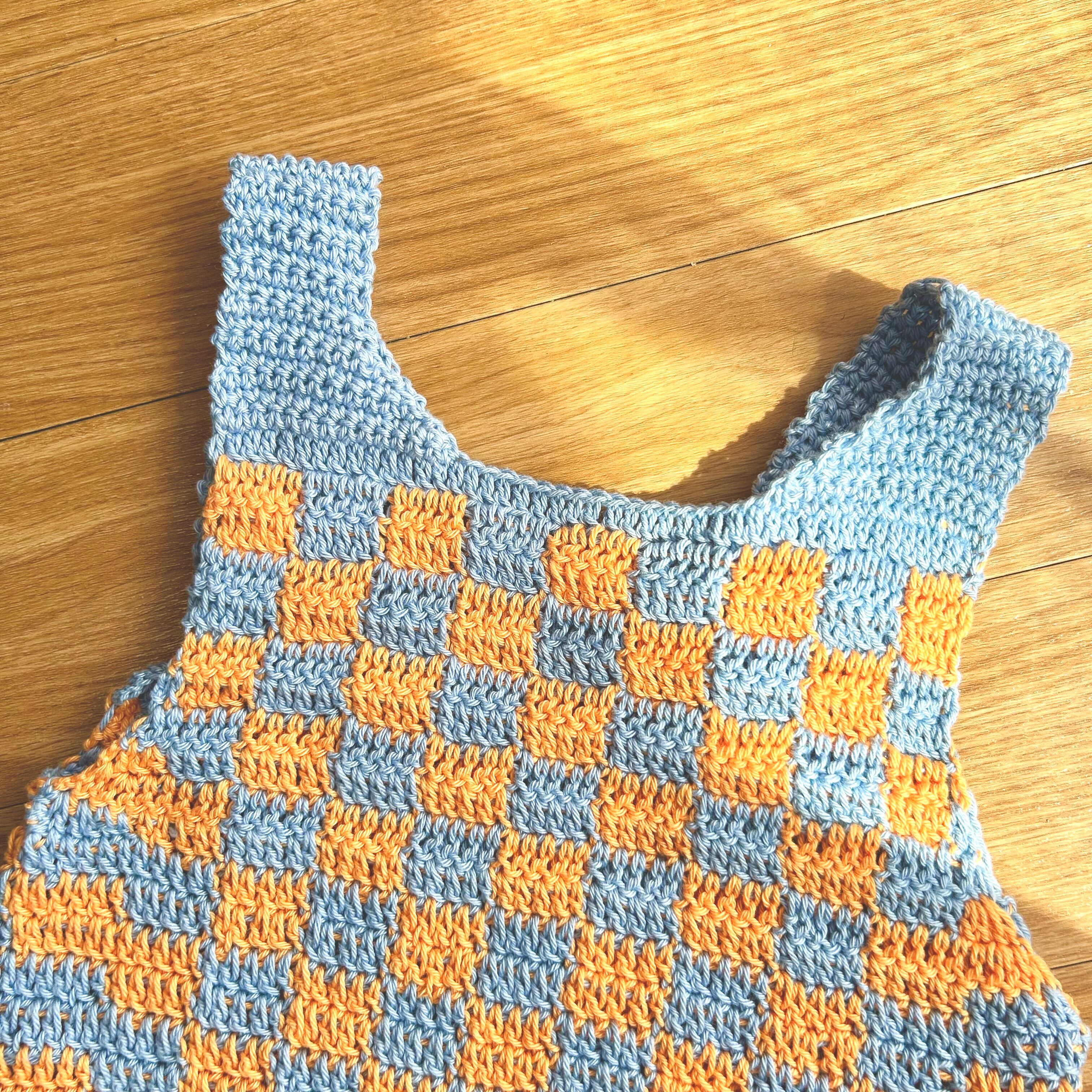 ブルー×オレンジ 鍵編みキューブチェックロンパース