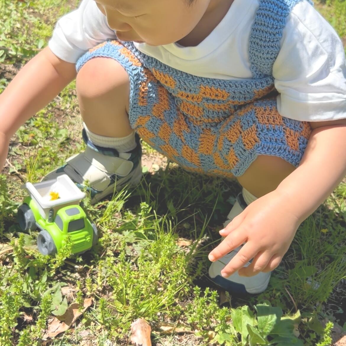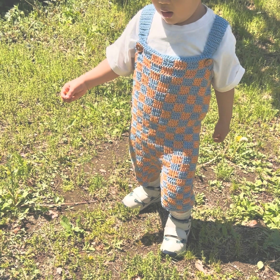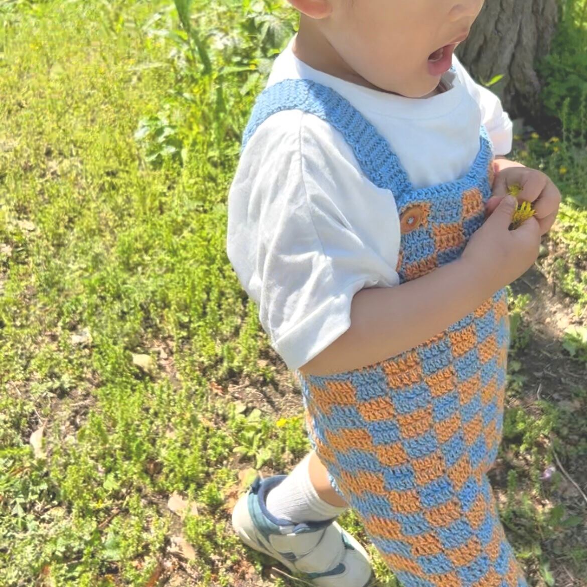 真四角のチェックを沢山編んでロンパースにしてみました。長く着れるようにボタンを2つつけてサイズ調節が可能。