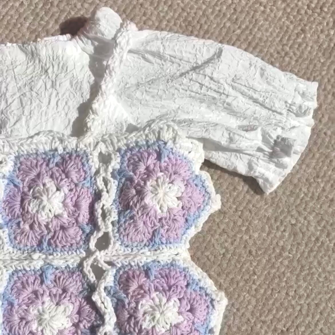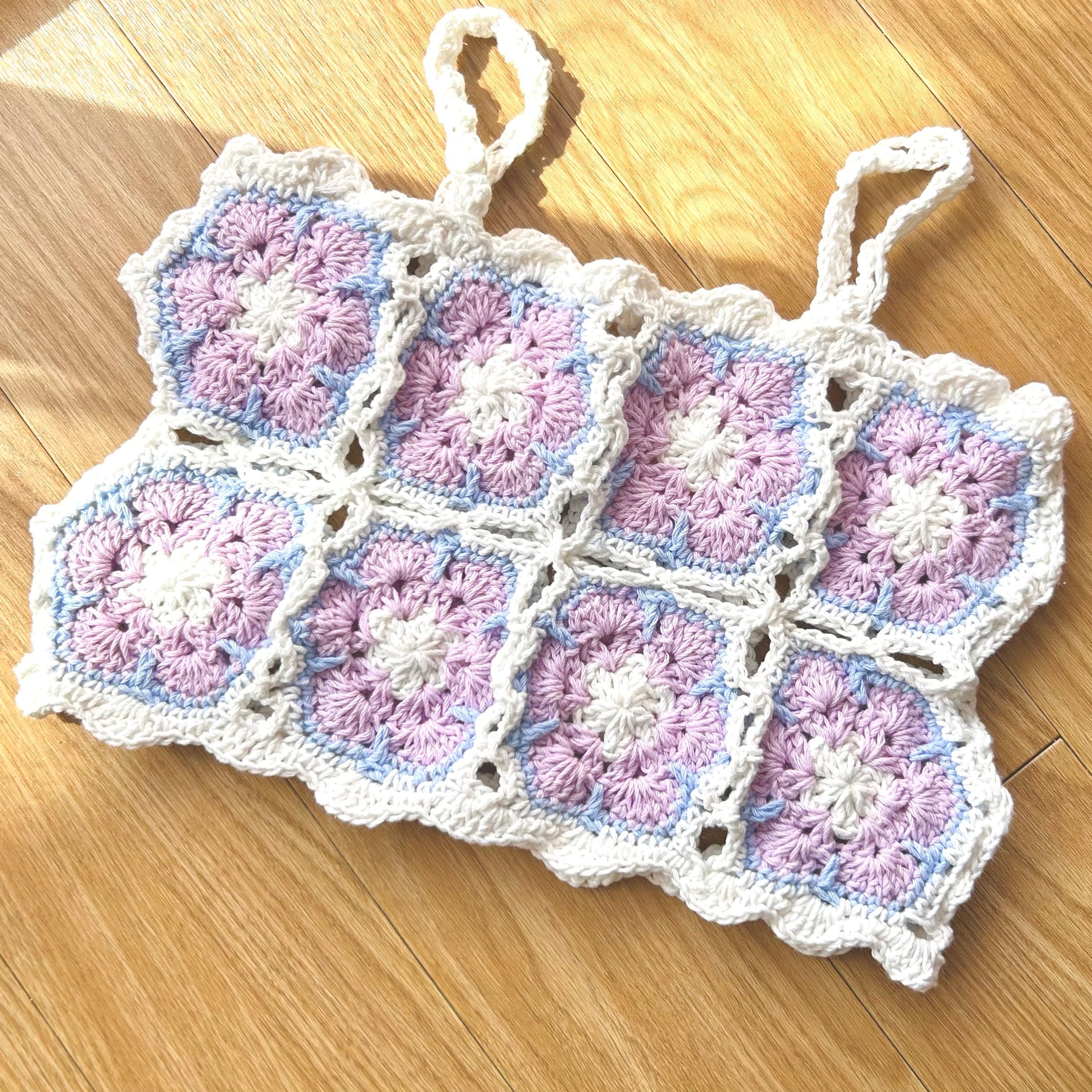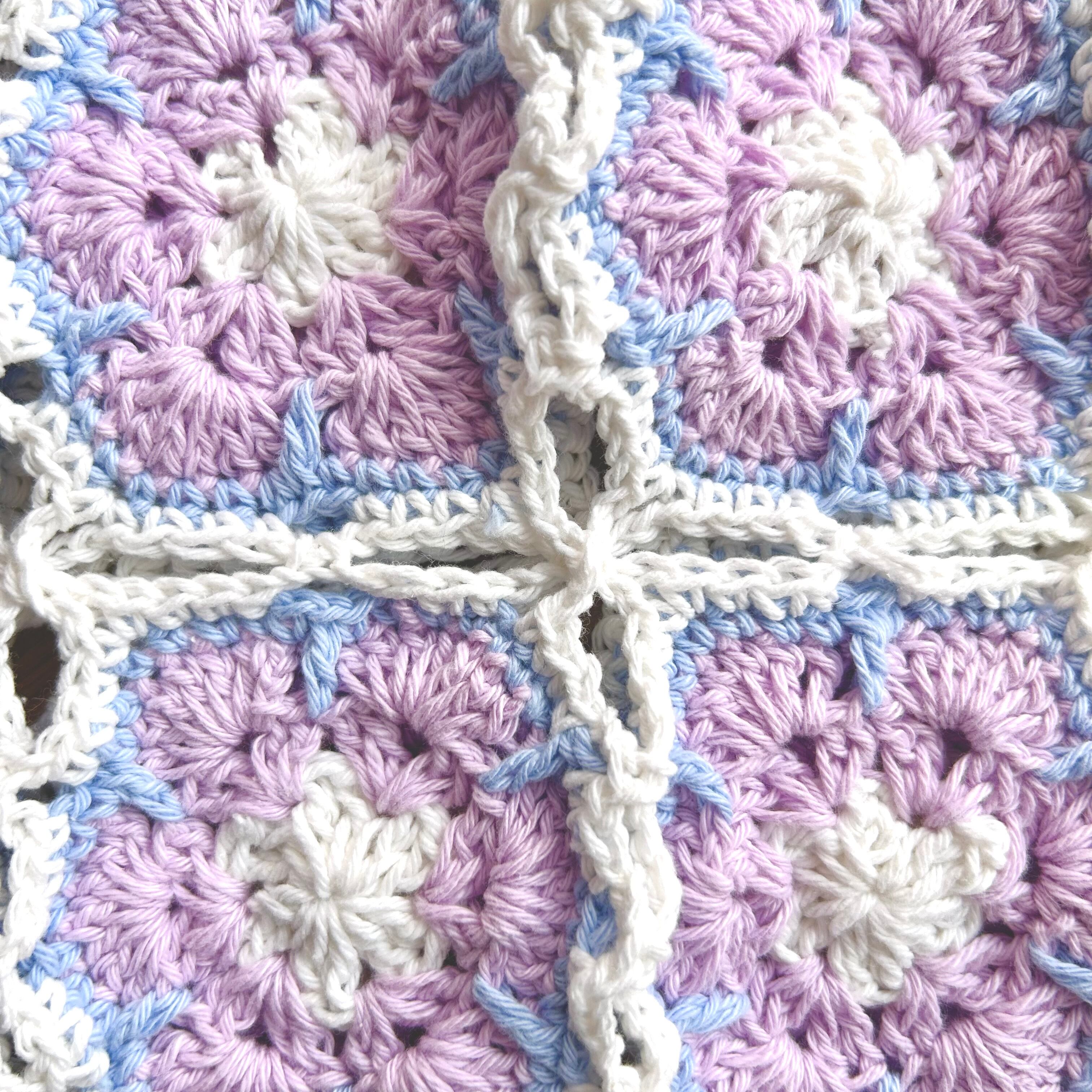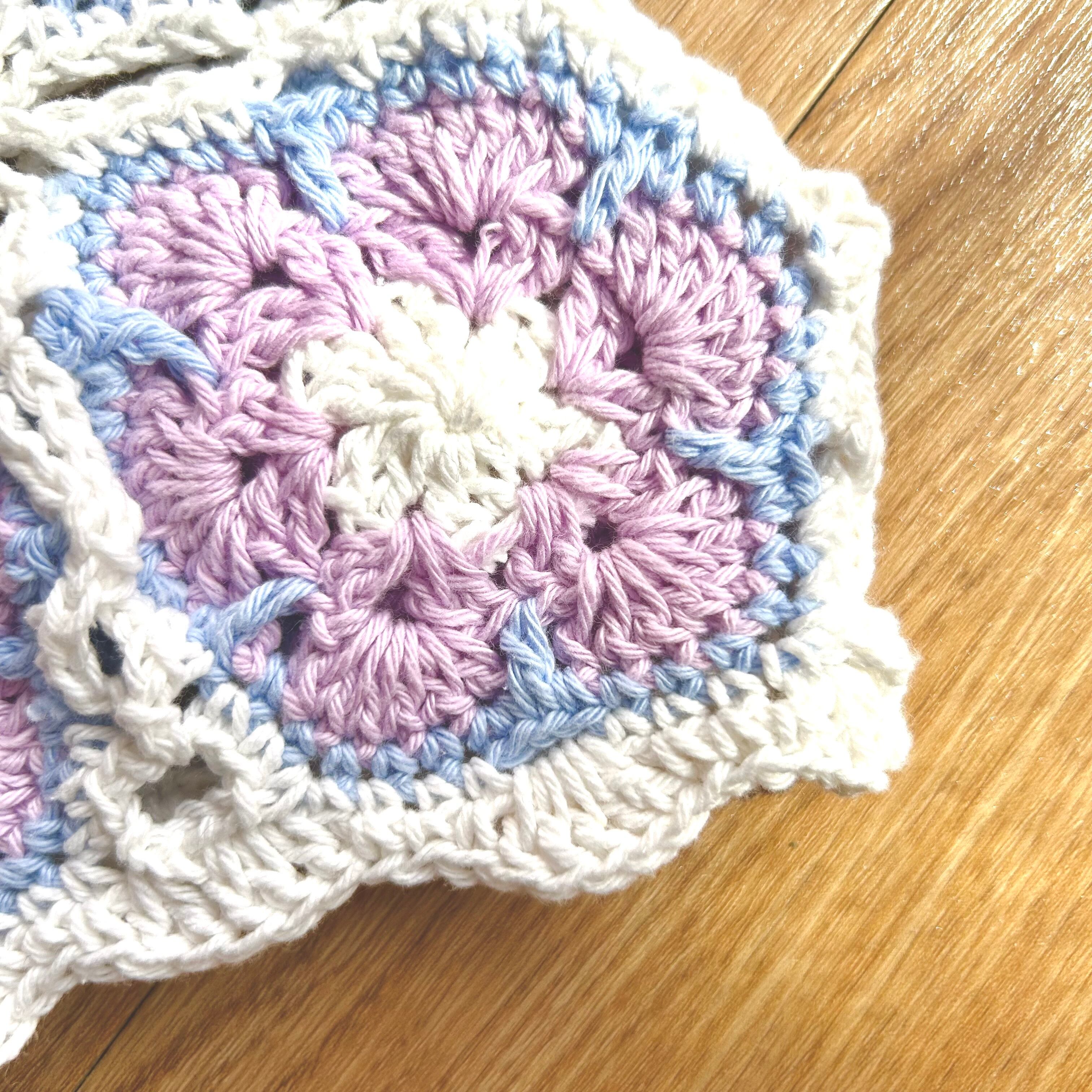 爽やかな色を組み合わせました。小さなアフリカンモチーフを編み上げ、つなぎ目は可愛らしく白いお花が咲いているようにしてみました。