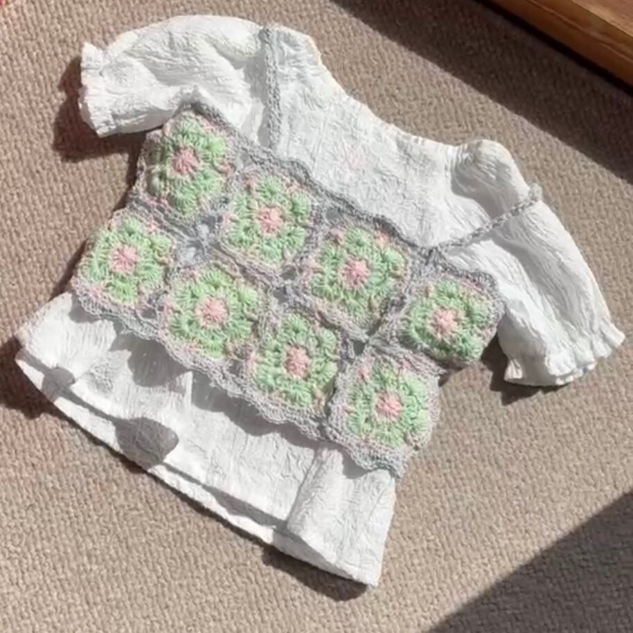 爽やかな色を組み合わせました。小さなアフリカンモチーフを編み上げ、つなぎ目は可愛らしく白いお花が咲いているようにしてみました。