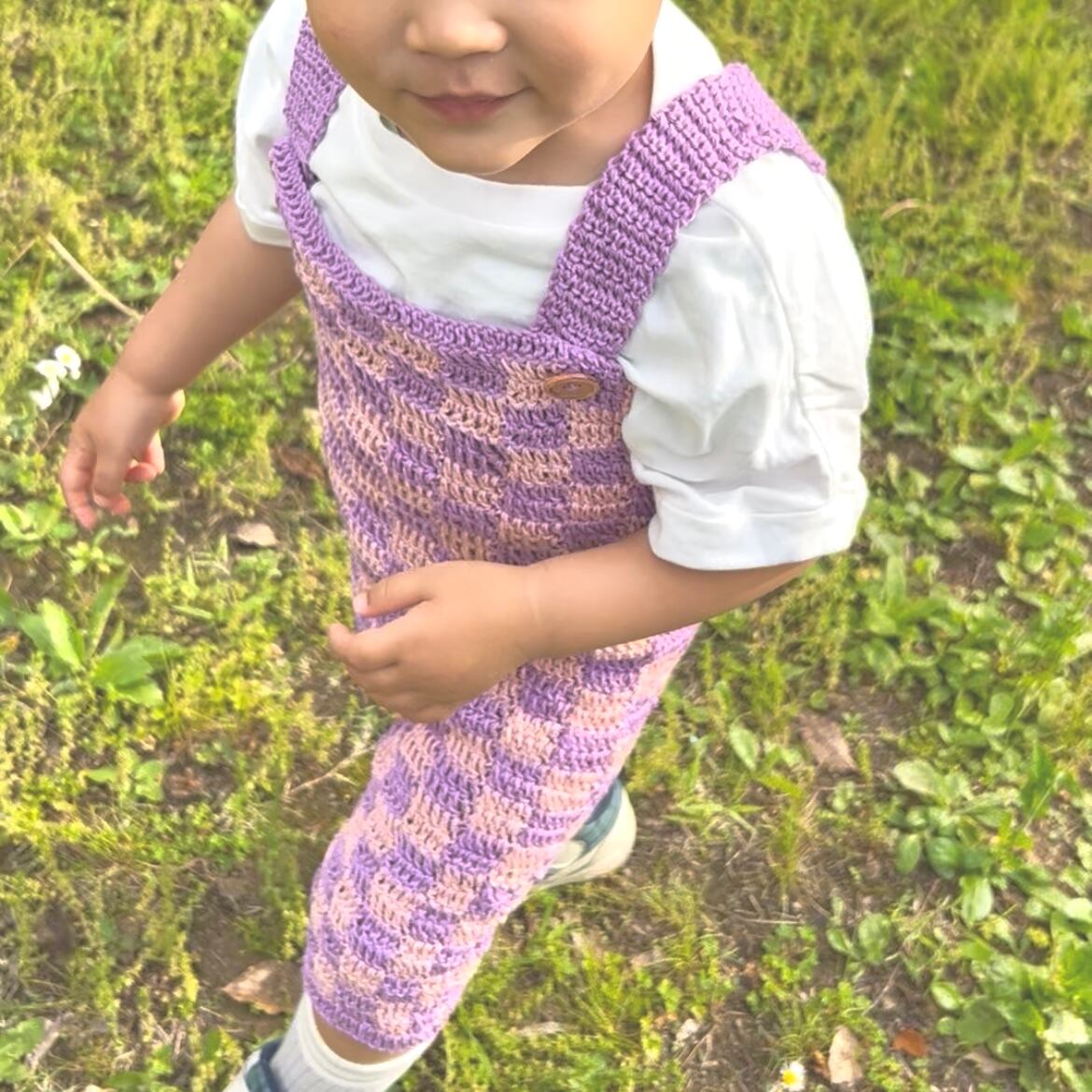 ラベンダー×ピンク 鍵編みキューブチェックロンパース