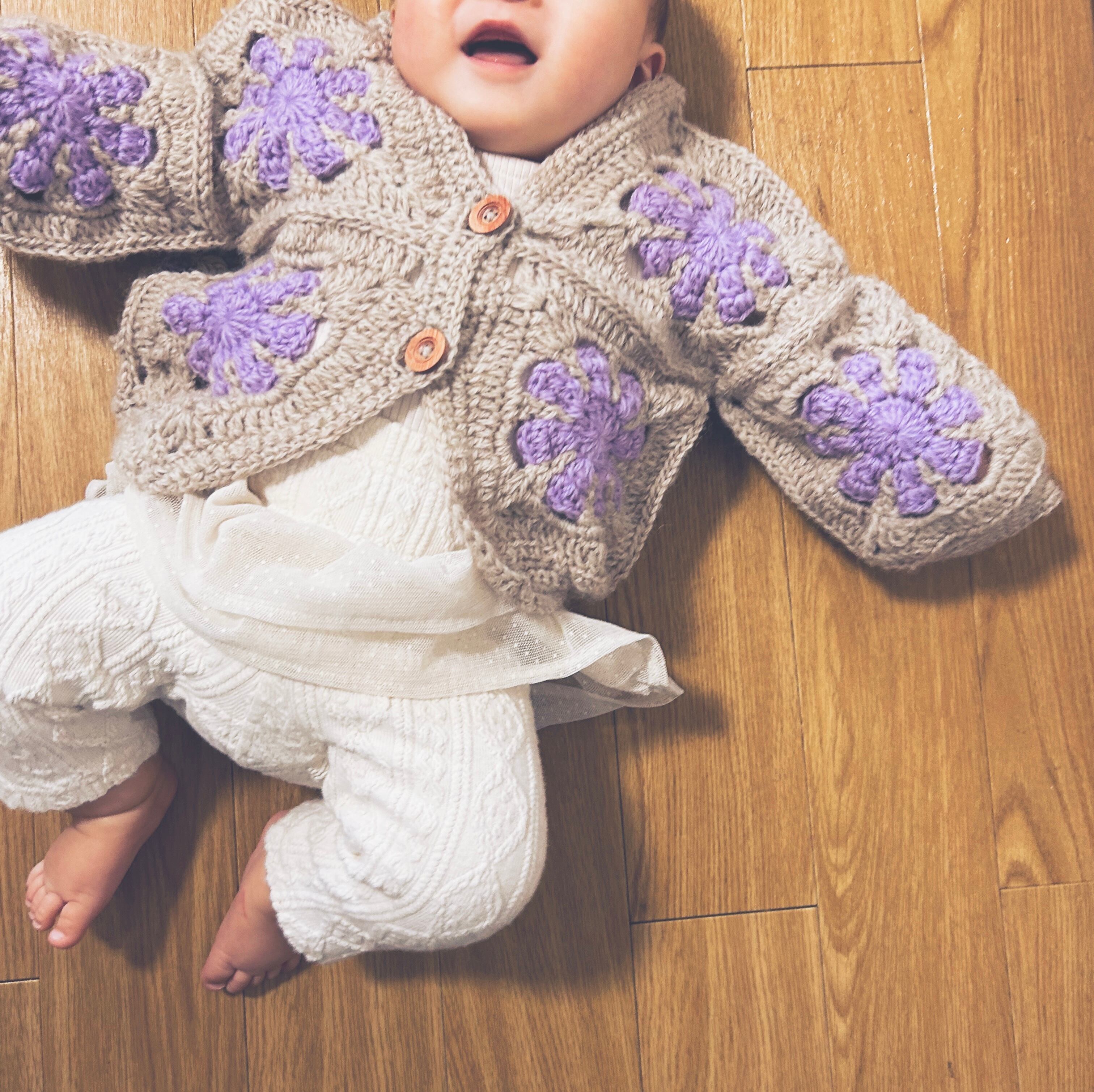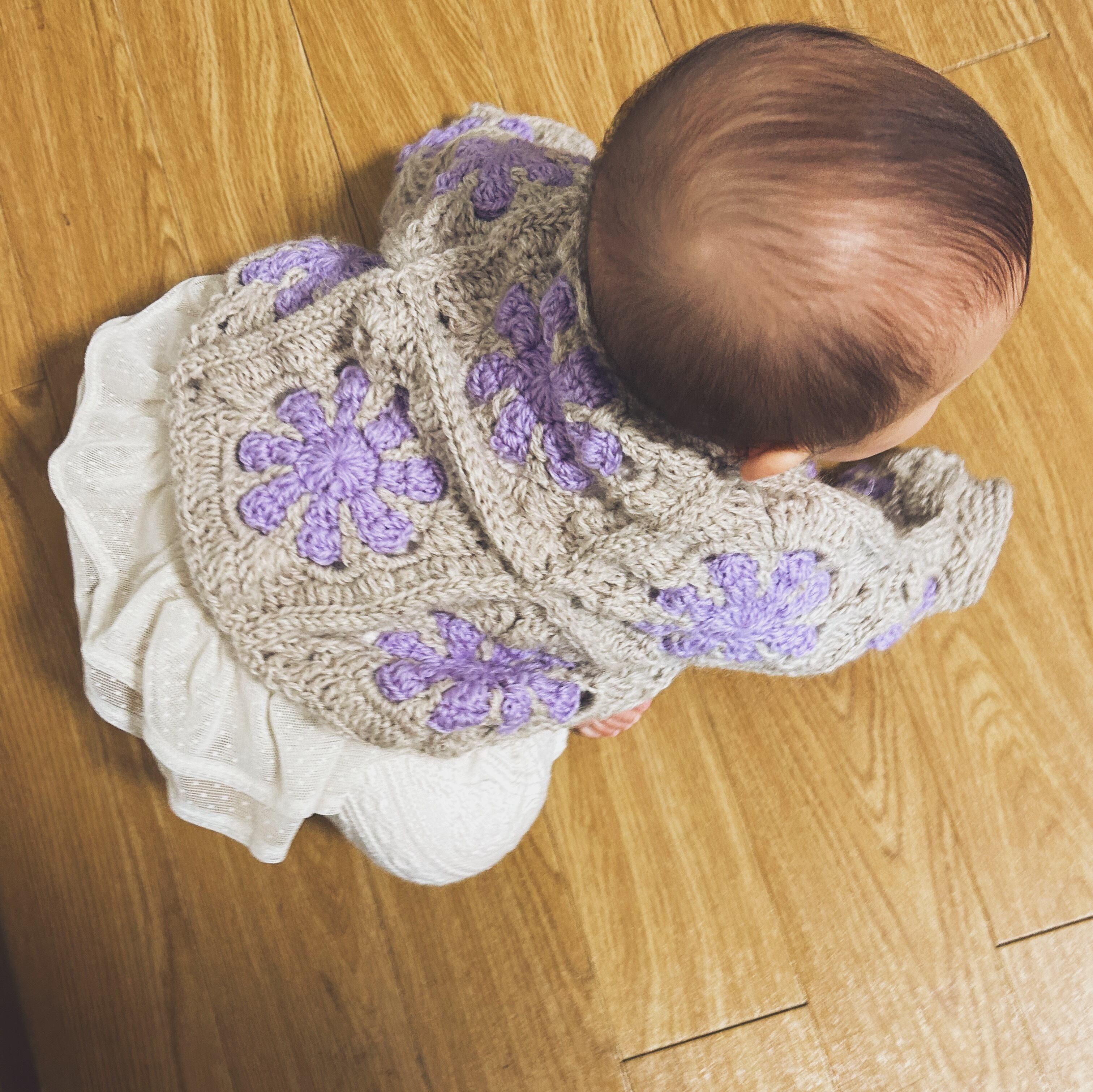 何かとかさばらないカーディガンを選ぶ方、多いと思います。そんなママの気持ちを考えて編んでみました。